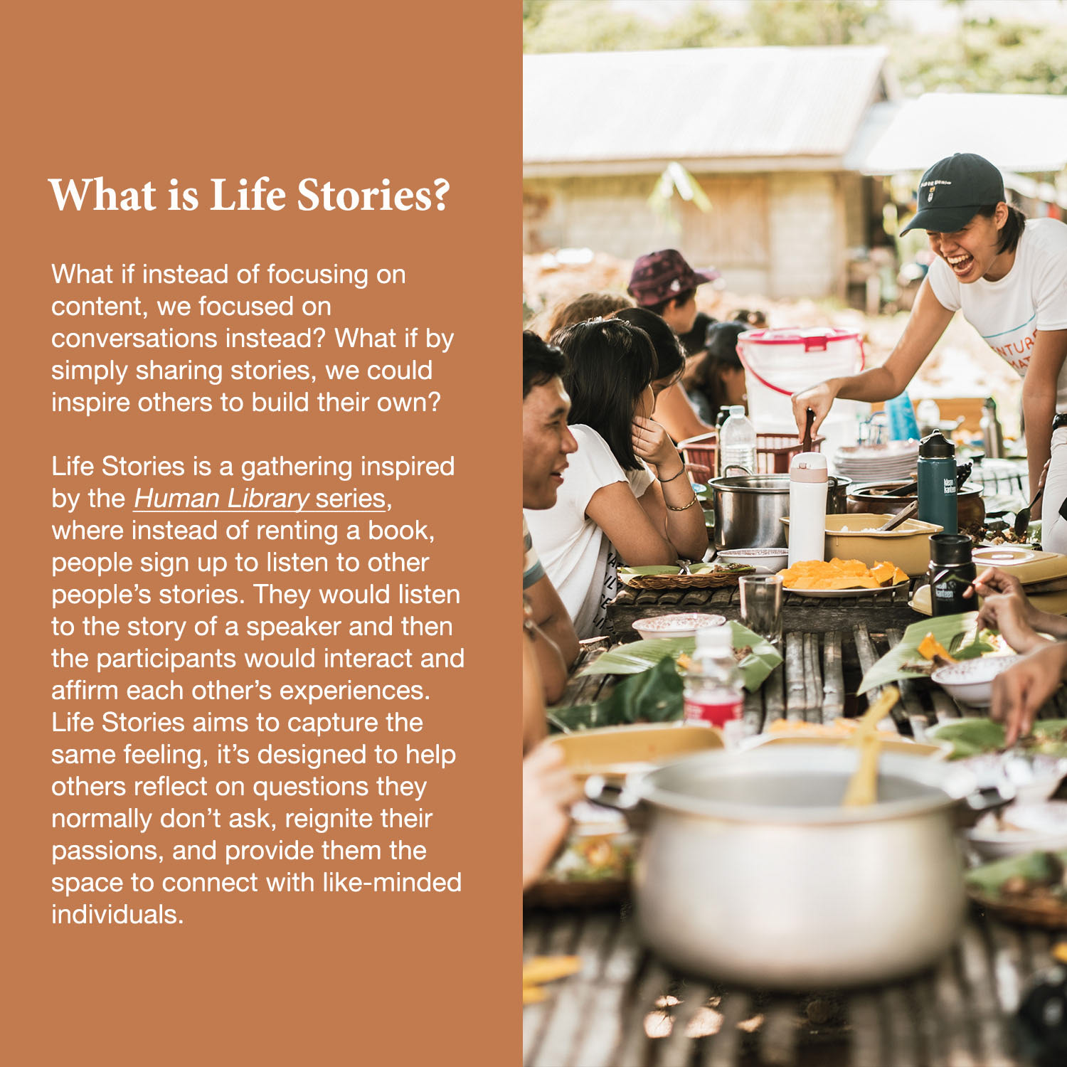 Life Stories was inspired by The Human Library Organization, where personal stories are seen as ‘book chapters’ that can serve as points for reflection. Each of the chosen Life Stories participants represented various advocacies in the Philippines, such as food sovereignty, environmental protection, and diversity and inclusion.